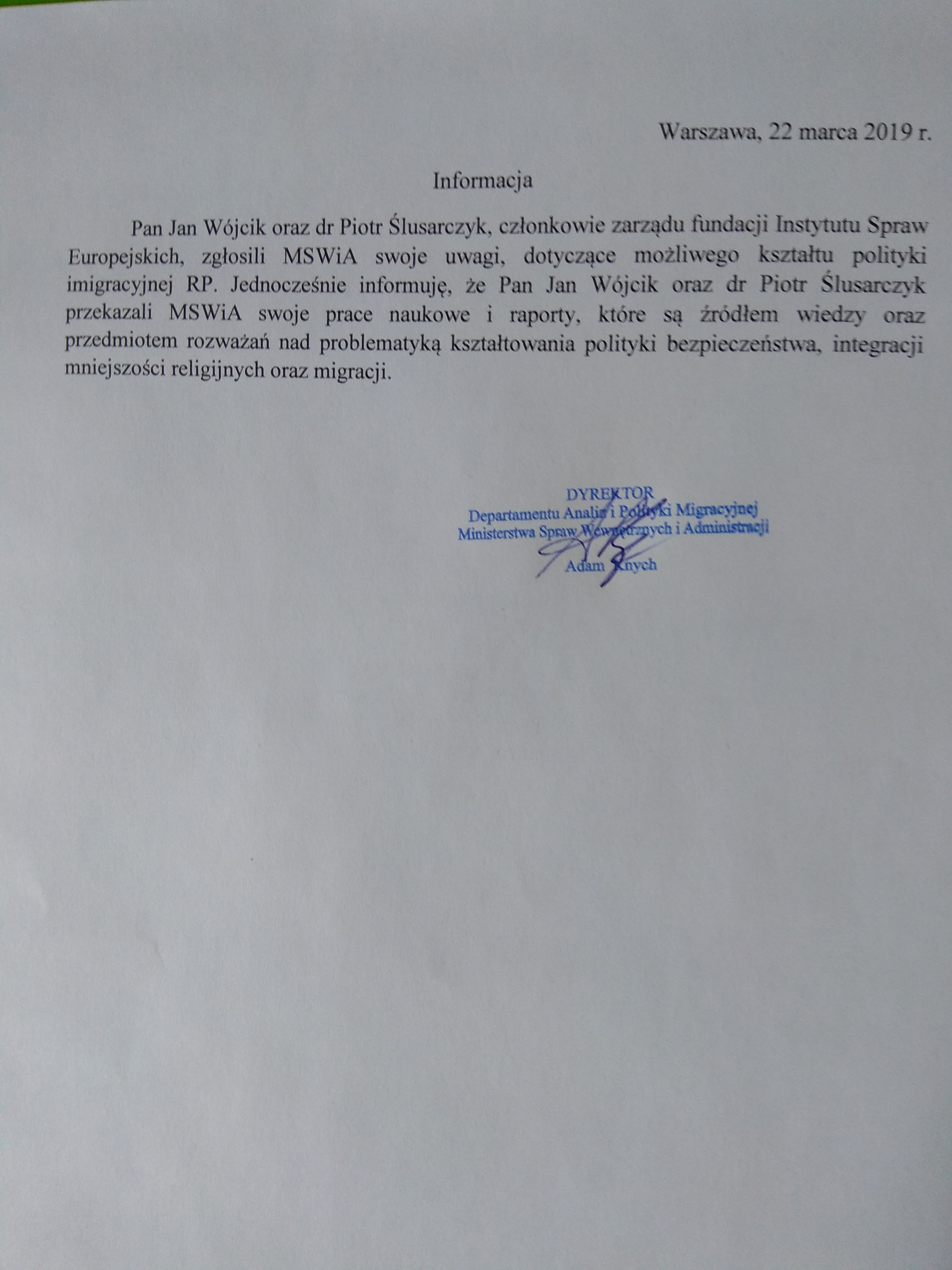2. Potwierdzenie współpracy z MSWiA w zakresie tworzenia Polityki Imigracyjnej.