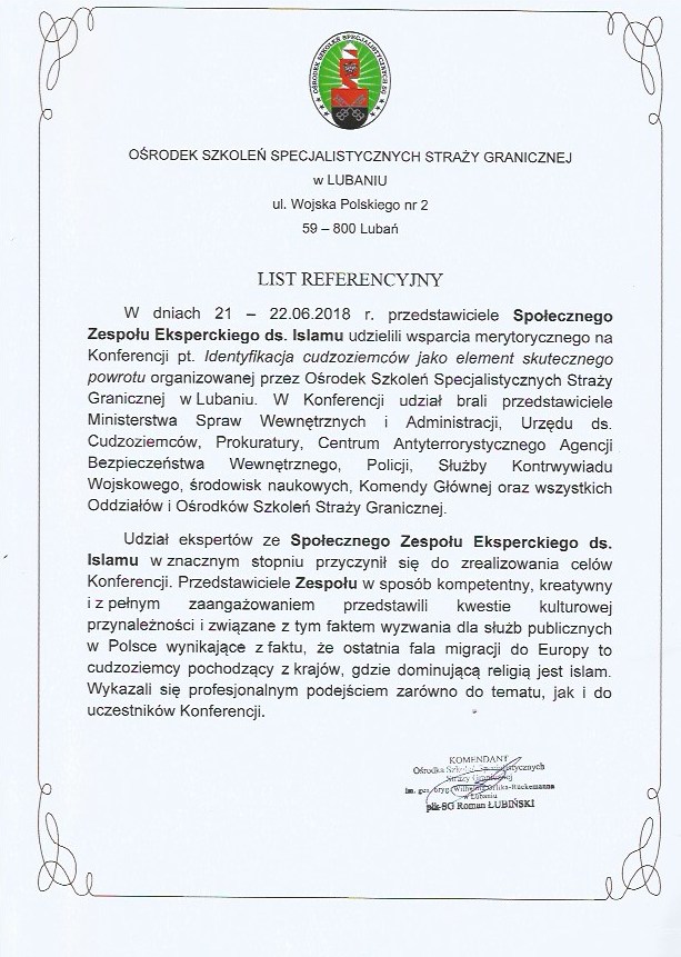 1. Rekomendacje Ośrodka Szkoleń Specjalistycznych Straży Granicznej w Lubaniu dla zespołu ekspertów; oraz indywidualnie dla dr Piotra S. Ślusarczyka  w związku ze wsparciem merytorycznym w konferencji „Identyfikacja cudzoziemców jako element skutecznego powrotu” (21-22.06.2018).